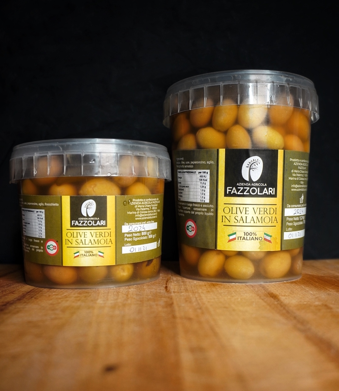 Olive verdi in salamoia conservate con acqua, sale, peperoncino, aromi naturali
