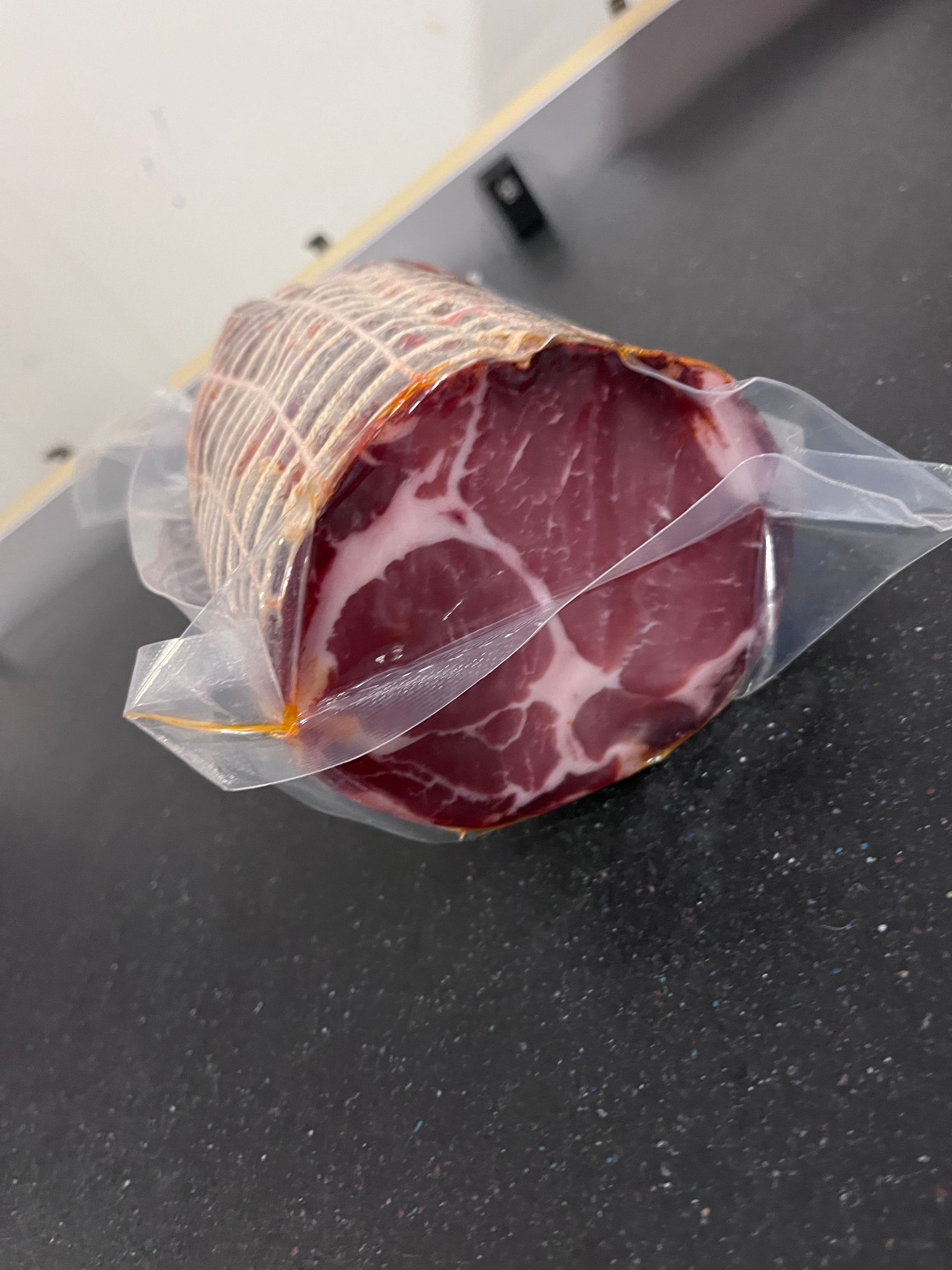Il capocollo è un delizioso e pregiato salume che sicuramente farà la felicità dei palati più esigenti. Proveniente dalle migliori tradizioni gastronomiche italiane, il capocollo è una specialità insuperabile che conquista con il suo gusto unico e la sua texture morbida. Il nostro capocollo è realizzato con cura artigianale, utilizzando solo le migliori carni suine selezionate. La carne viene attentamente disossata e rifinita a mano per garantire un prodotto di altissima qualità. La parte centrale del collo viene aromatizzata con una miscela segreta di spezie tradizionali, che conferiscono al capocollo il suo inconfondibile sapore intenso e aromatico. La stagionatura avviene lentamente e naturalmente, per permettere al capocollo di sviluppare tutti i suoi profumi e la sua morbidezza caratteristica. Il risultato finale è un capocollo di eccellenza, dal gusto ricco e rotondo, con una delicata nota di spezie che si fonde perfettamente con la dolcezza della carne. Il nostro capocollo è un vero e proprio simbolo della cucina italiana, ideale per creare gustosi panini, antipasti sfiziosi o piatti principali dal sapore autentico. Versatile e apprezzato da tutti, il capocollo è perfetto per arricchire i tuoi piatti e regalare un'esperienza culinaria indimenticabile. Scegli il nostro capocollo e preparati a vivere un'esplosione di sapori e aromi che ti trasporteranno direttamente nel cuore dell'Italia. Ti garantiamo un prodotto di altissima qualità, realizzato con passione e dedizione, per offrirti il meglio della tradizione italiana sulla tua tavola. *PREZZO AL KG*