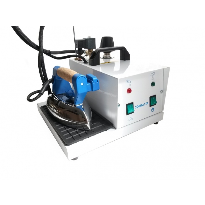 Ferro da stiro a caldaia, questo è un prodotto di altissima qualità prodotto in Italia e particolarmente adatto all’uso domestico. L’esperienza nella costruzione viene acquisita nel campo dell’industria per l’attrezzatura da stiro professionale. La scocca esterna della caldaia è verniciata di color bianco reistente all’usura, mentre le raccorderie sono in acciaio inox. Le sue caratteristiche tecniche e i vari dispositivi rendono Compacta uno dei migliori ferri, il pressostato e la valvola esterna per la regolazione del vapore ne garantiscono la qualità e sicurezza, le prestazioni elevate e l’ottimo funzionamento. Robustezza e compattezza sono qualità di COMPACTA che insieme al suo design, le conferiscono un tocco di classe. Caratteristiche del prodotto: - Alimentazione 220V - Pressione esercizio 2,5 BAR - Resistenza caldaia 1000 W - Resistenza ferro 800 W - Capacità caldaia 1,5 LT. - Autonomia stiro: oltre 3 ORE - Peso 10 KG - Dimensione 270 X 420 X 300 mm