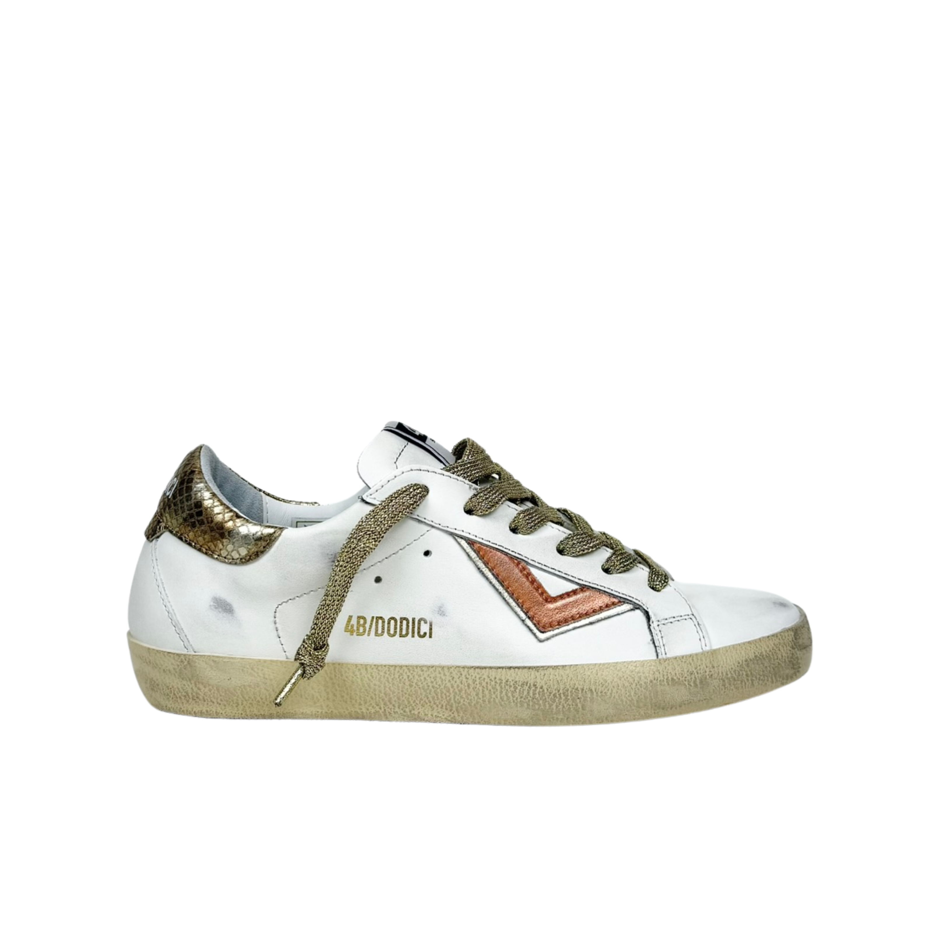 Classica silhouette low top trainer di QB/DODICI. Il must have dell'azienda è realizzato in pelle di colore bianco. Sul lato esterno sono presenti dettagli in pelle laminata rosa ed il nome dell'azienda impresso colore oro. Nella parte posteriore il talloncino è in pelle effetto pitone bronzo. I lacci sono piatti in in lurex e glitter di colore oro. La suola è in gomma effetto vintage. La soletta interna è estraibile e ben ammortizzata. Internamente è foderata in morbida spugna di cotone. Altezza tallone dal suolo 3 cm. Collezione Primavera Estate 2025. Made in Italy ISCRIVITI alla NEWSLETTER, per TE un COUPON del 10% valido sul TOTALE CARRELLO. Inoltre lo potrai RIUTILIZZARE per tutti gli ACQUISTI EFFETTUATI su MAPEBO.IT