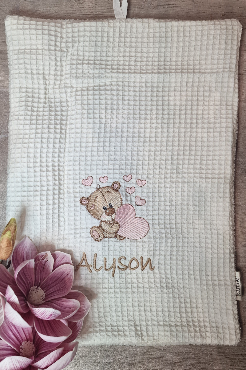 Asciugamanino in tessuto nido d'ape ideale per l'asilo, personalizzato con nome e immagine ricamati Composizione e materiali Cotone nido d'ape certificato Oeko-Tex Consigli per il lavaggio Lavare a mano o lavatrice a 30°- 40°. No candeggio Asciugatrice sconsigliata Stirare a bassa temperatura Dimensioni: Larghezza 28 cm; Altezza 38 cm