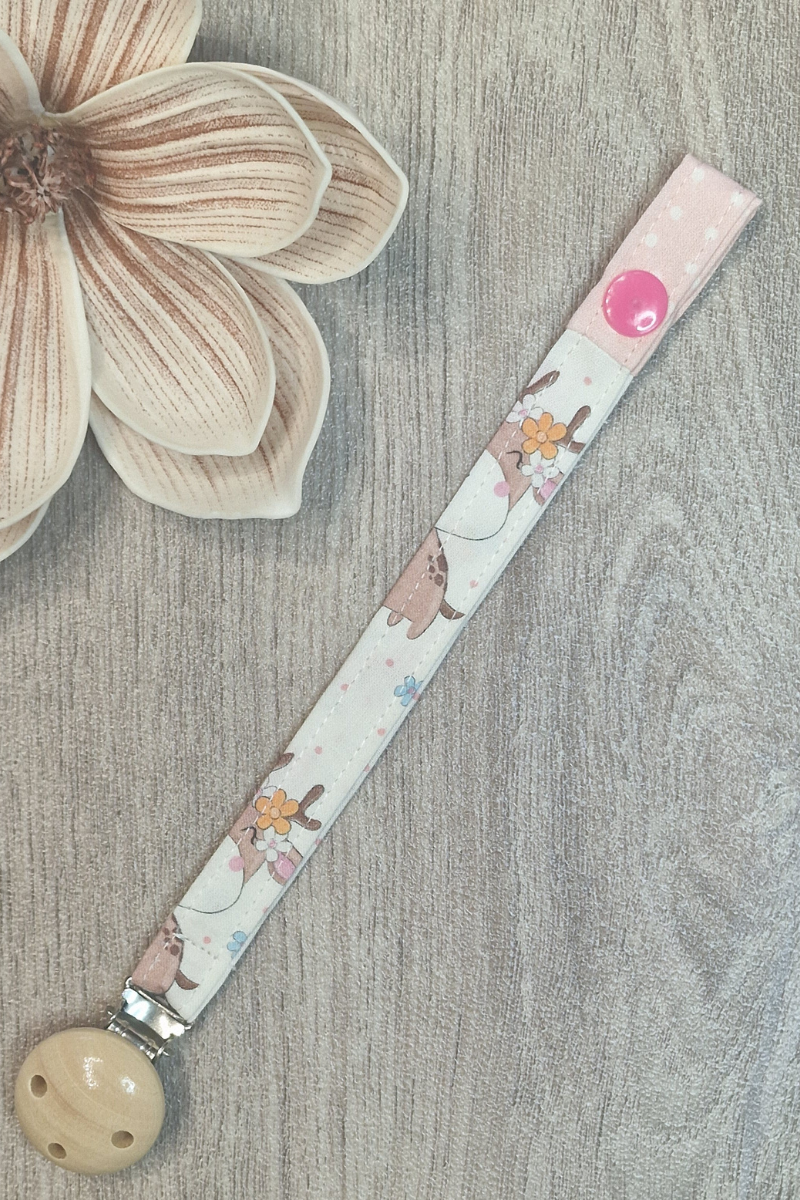 Comodi e simpatici porta ciuccio Composizione e materiali Tessuto in cotone certificato OEKO-TEX® Chiusura con bottone automatico Consigli per il lavaggio Lavare a mano o lavatrice a 30° Non usare asciugatrice Stirare a bassa temperatura e non sulle parti in plastica