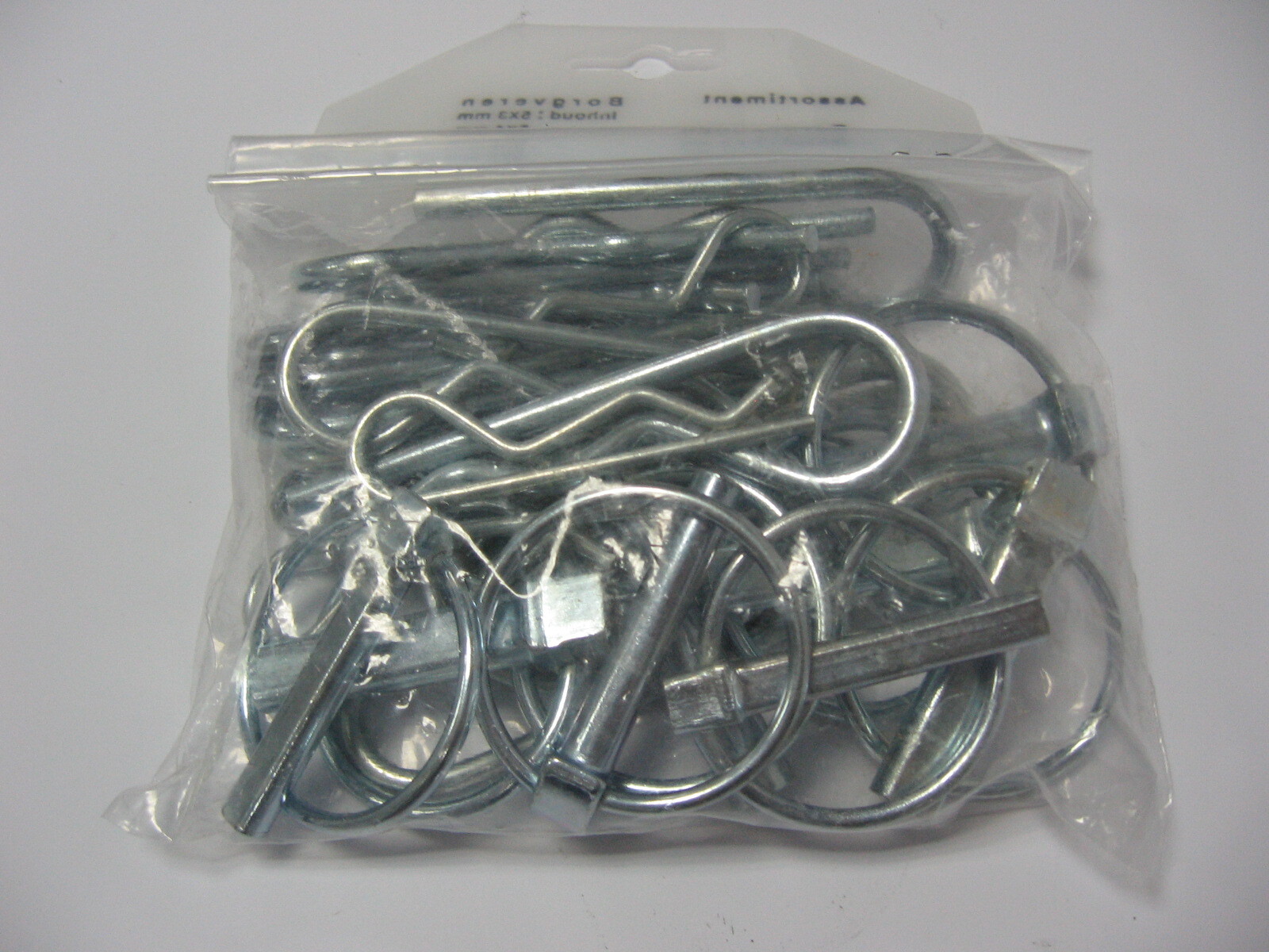 BUSTA MISTA CON 26 PEZZI, TRA CUI: 3 SPINE A SCATTO DA 8mm 5 SPINE A SCATTO DA 11mm 5 COPPIGLIE TIPO R DA 3mm 5 COPPIGLIE TIPO R DA 4mm 5 COPPIGLIE TIPO R DA 5mm 3 COPPIGLIE TIPO R DA 6mm MATERIALE ZINCATO