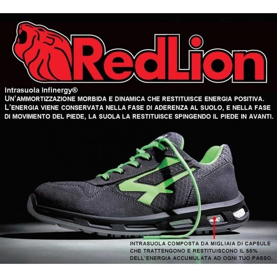 ART:INFINITY Scarpe antinfortunistiche alte, leggere e comode u power della linea Red Lion, con tomaia in pelle nabuk naturale bottalato, traspiranti, idrorepellente, puntale in alluminio, antiperforazione, antiscivolo e suola PU/PU, Soffice PU espanso in infinergy S3 SRC CI ESD. Taglie 35-48.