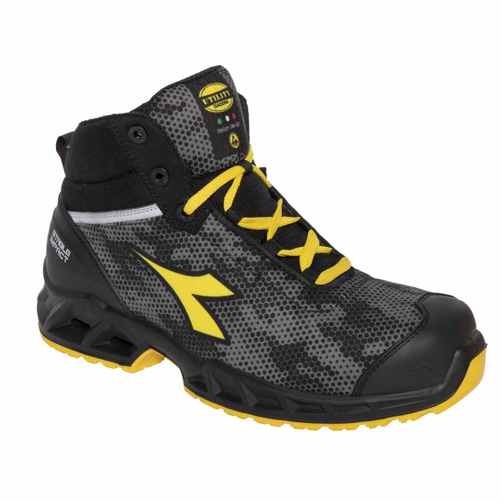 Scarpa antinfortunistica alta Colore: NERO/GRIGIO Puntale in alluminio 200J. Calzata 11. Fodera Air Mesh con antiscalzante in microfibra, K-SOLE, plantare in PU foam estraibile, traspirante e con carboni attivi. ESD.